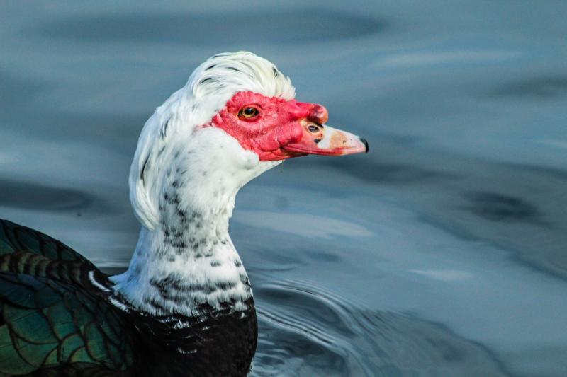 中国番鸭体躯长而宽,前后窄小,呈纺锤形,体躯与地面呈水平状态。头中等大小,喙较短而窄,呈“雁形喙”。喙基部和眼周围有红色或黑色皮瘤,上喙基部有一小块突起的肉瘤,雄性较雌性发达。头顶有一排纵向长羽,受刺激时会竖起。胸部宽而平,后腹不发达,尾狭长,翅膀长达尾部,腿短而粗状。羽毛分黑、白、黑白花,少数呈银灰色和赤褐色。