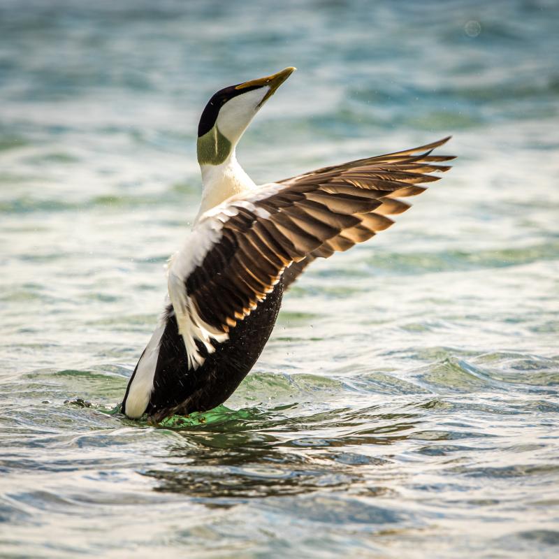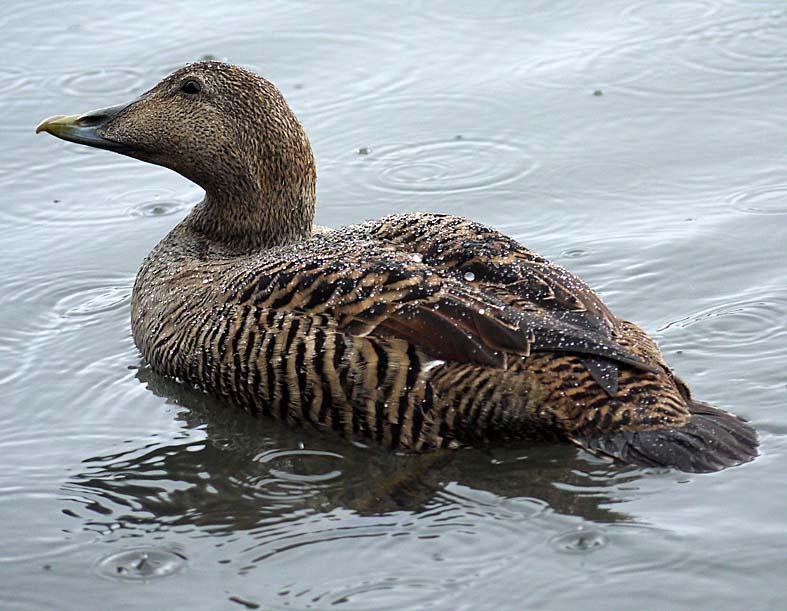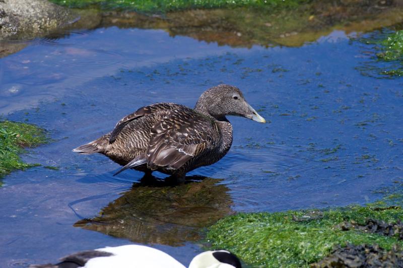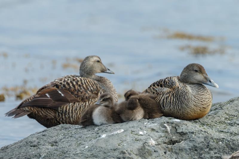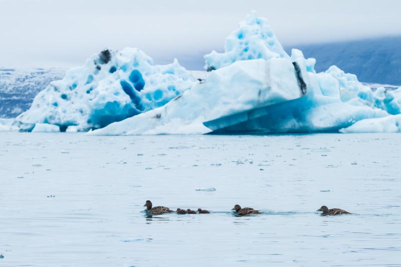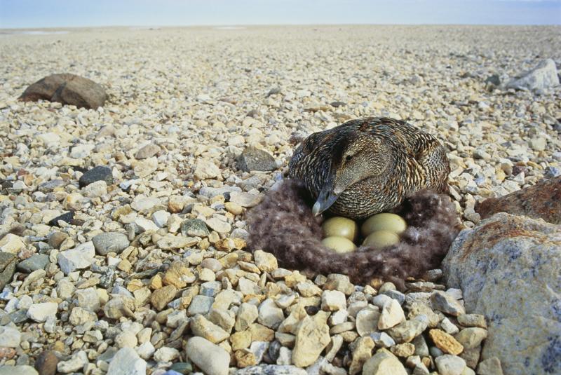 欧绒鸭,一种在一个多世纪前的冰岛就已经受法律保护的个体较大的极地野鸭,拉丁语叫 Somateria Mollissima。雄鸭的上体主要为白色,头顶、腹和尾黑色。体大而圆,喙有隆起。雄绒鸭毛色一般为黑白相间,而雌绒鸭身体的大部分则呈褐色。绒鸭每年春天都聚集栖息在北大西洋沿岸筑巢,雌绒鸭会从自己身上啄下 17 克左右棕灰色、非常轻的羽绒于鸟巢中保温孵化 4-5 只鸭蛋。在小鸭被孵出以后,所有欧绒鸭都会返回到海洋中去。而留在鸟巢的棕灰色羽绒就是全世界独一无二的欧绒鸭绒原料。