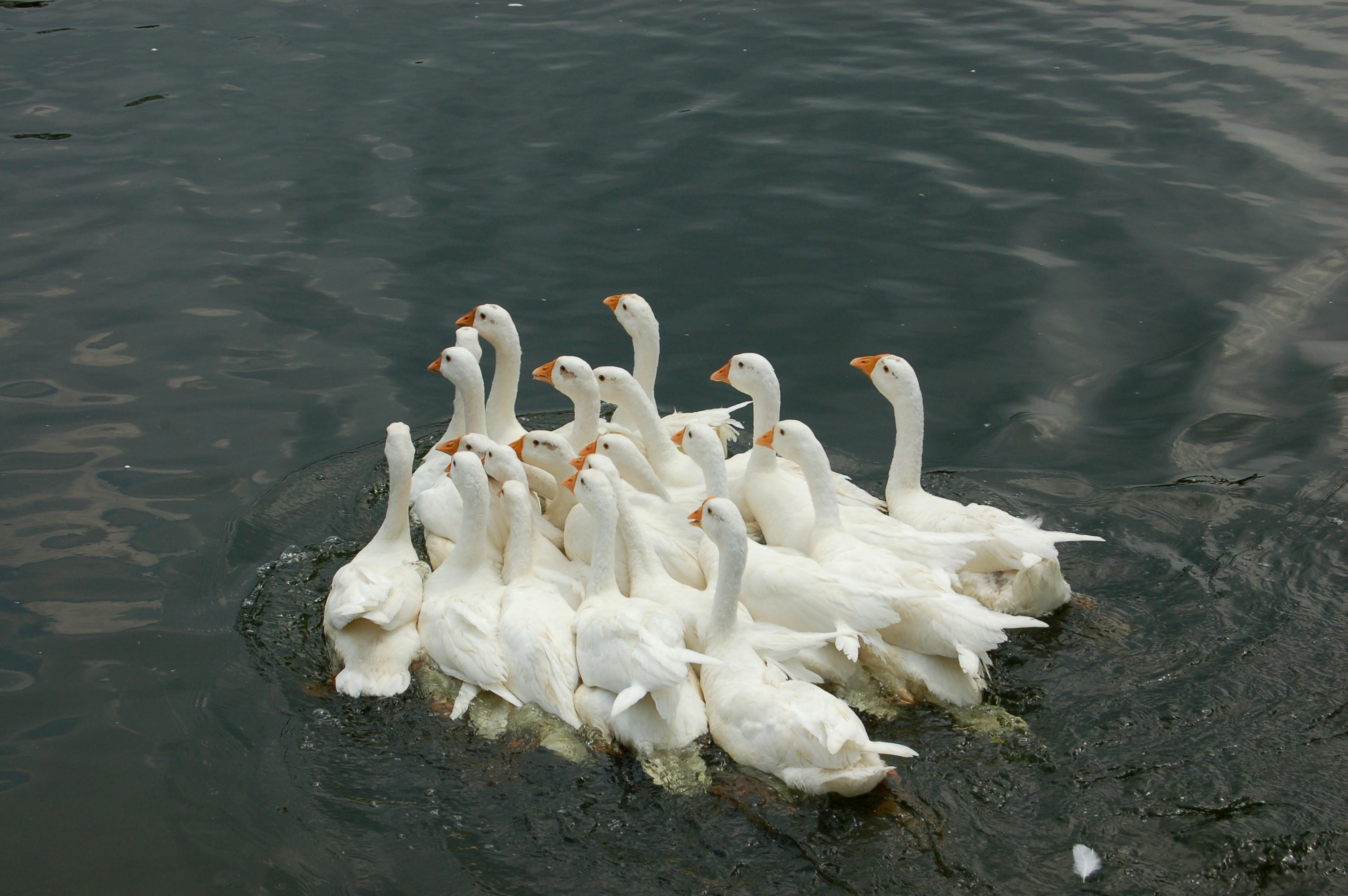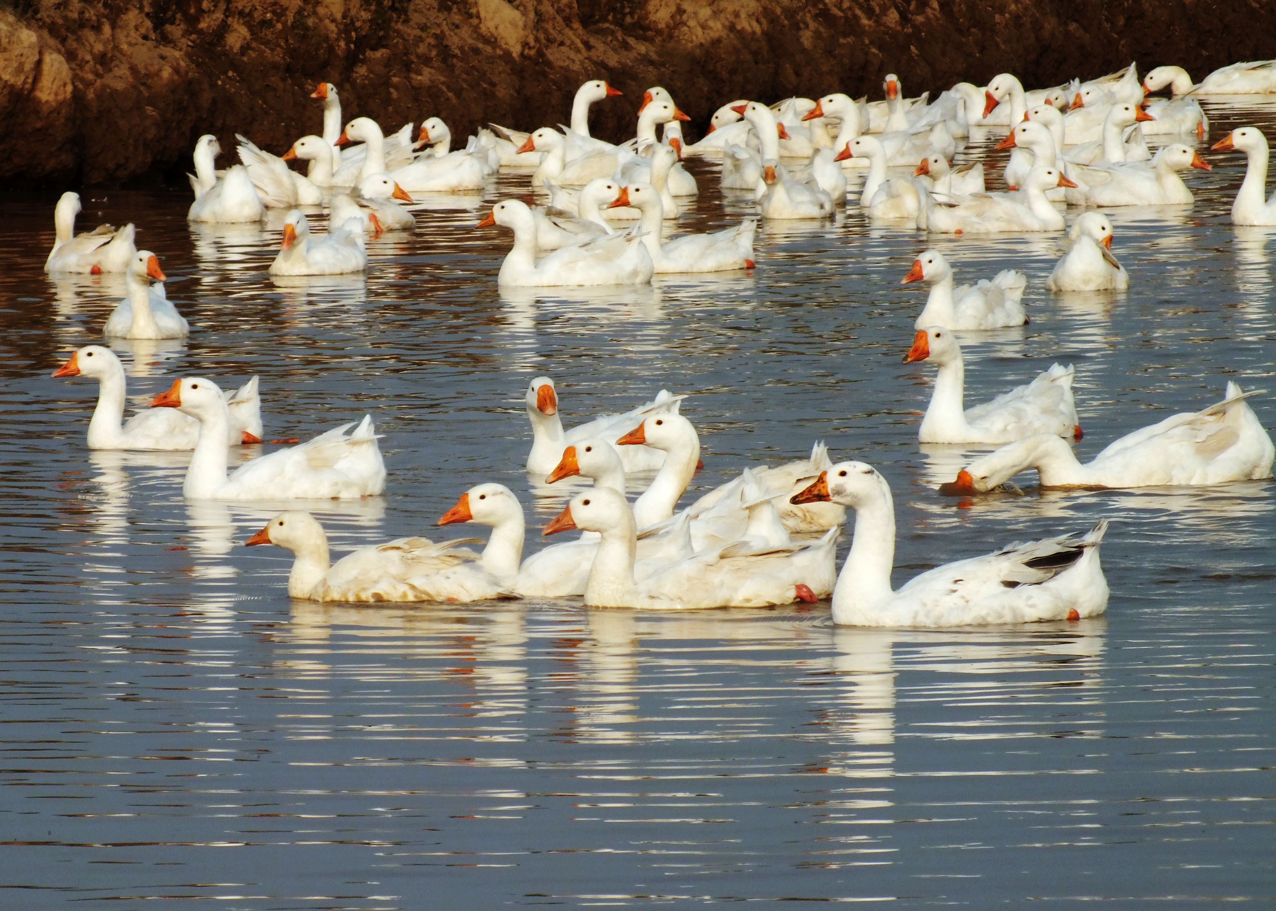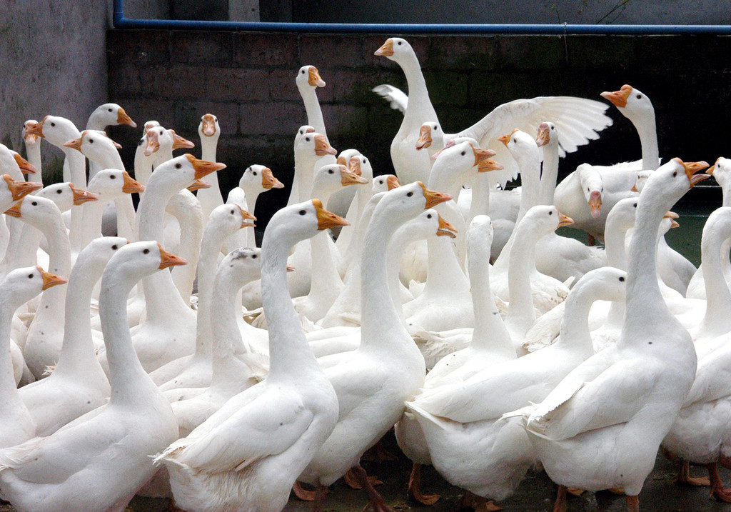 皖西白鹅产区地处亚热带的北缘,属湿润季风气候。季风显著,雨量适中;冬冷夏热,四季分明,光照充足,无霜期较长。皖西白鹅体型健壮,体态高昂,气质英武。长颈呈弓形,胸深广,背宽平。全身羽毛洁白,头顶长有橘黄色寿星头状肉瘤,故而得名“狮头白鹅”。狮头白鹅产毛量高,羽绒洁白,弹性好,蓬松度佳,以绒朵大而著称。平均每只鹅产毛349g,其中产绒量为40~50g。目前产区每年出口羽绒占全国出口量的10%,居全国第一位。狮头鹅皮可鞣制裘皮,柔软,克重轻,保暖性好。是制作服装、工艺品的优质材料。